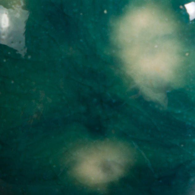 Cone 6 oxidation (small photo): Base glaze remains – crystals fade and melt. Enhanced mobility. Surface issues may occur.
