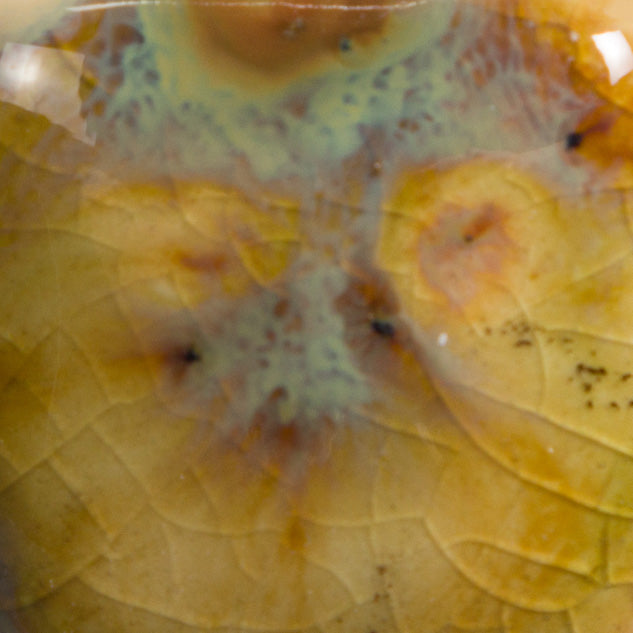Cone 6 oxidation (small photo): Base glaze fades – Green crystals change to brown; remaining crystals fade and melt. Enhanced mobility. Surface issues may occur.