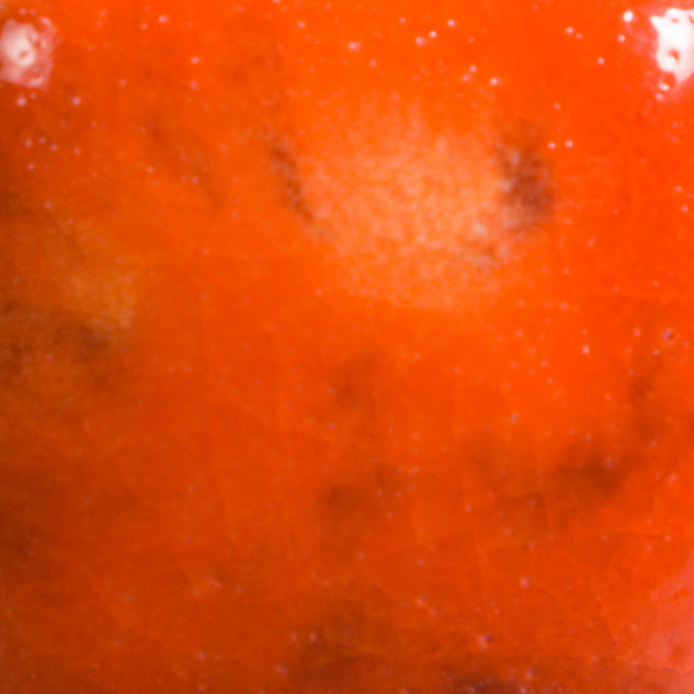 Cone 06 oxidation (large photo): Wildfire is an opaque orange base glaze with large yellow crystals that bloom and small black specks.
