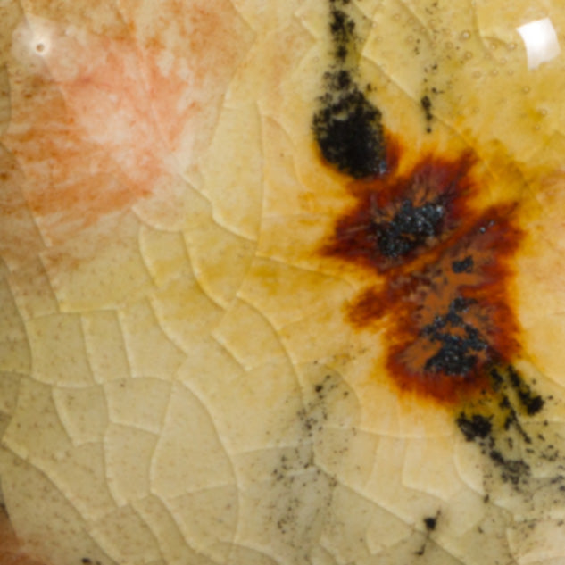 Cone 6 oxidation (small photo): Base glaze fades – crystals fade and melt. Enhanced mobility. Surface issues may occur.